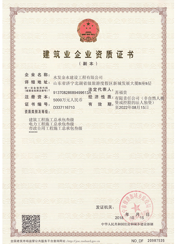 水发金水建设工程有限公司 建筑、电力、市政资质证书
