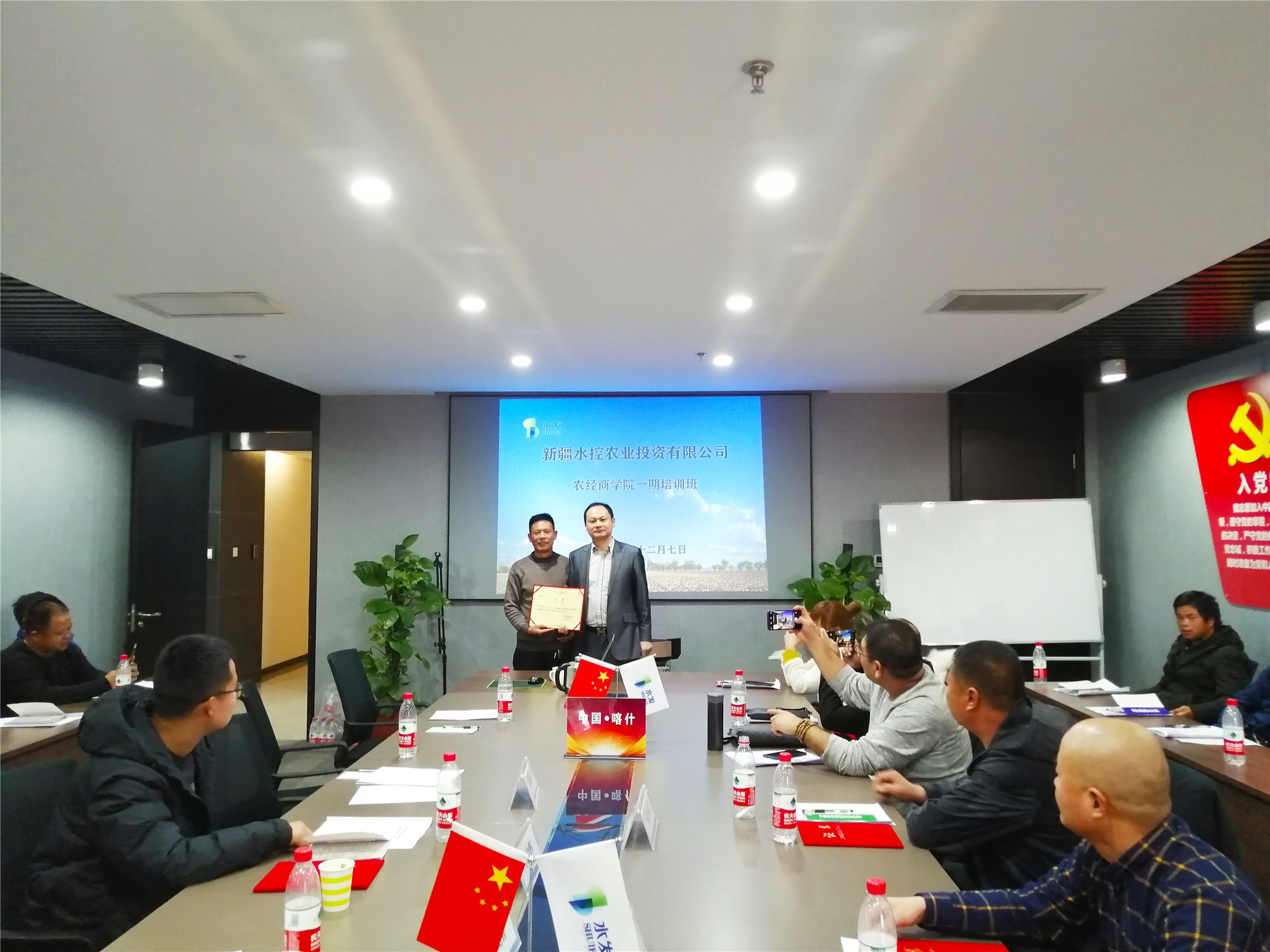 开班仪式上,王占先以“扎根新疆,合作共赢,共创农业全产业链闭环运营新模式”为主题,介绍了水控农发集团、新疆水控农业投资有限公司的发展历程、现状、未来五年的发展目标以及农业全产业链闭环运营的新模式。该模式以土地承包经营权为核心,全力整合上下游资源,实现“土地流转分包-智慧农业管理-农资农机及融资服务-棉花收购加工销售”的闭环运营,打造上下游多方利益共同体。该模式受到了与会种植合作单位代表的高度认同和积极参与。     高级农艺师李孟玉,曾创下了兵团棉花高产三连冠的佳绩,李老师以“棉花水肥一体化运筹技术”为主题,向与会学员讲授了棉花种植不同时期水肥运筹的关键技术点,并就学员遇到的实际困难和问题,进行了深入浅出的讲解。公司科技部负责人、农艺师刘和平,以“南疆棉花、甜菜丰产栽培关键技术”为主题,对棉花、甜菜种植的全过程,进行了系统的讲解。公司副总经理管海龙,向与会学员介绍了水控农发集团的具体惠农政策。培训课程由公司副总经理张弛主持,在完成了预定培训课程和笔试考核后,一期培训班圆满结束。