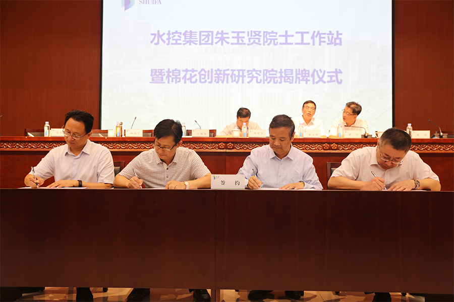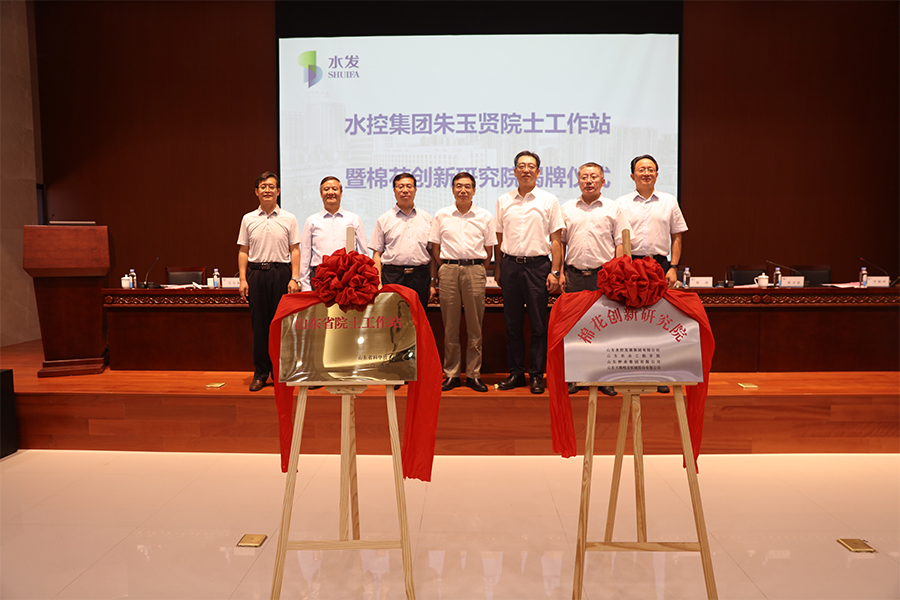 随后,朱玉贤、潘军、刘肖军、吴东振、王西奎、刘琦、杨丙生一同为水控集团朱玉贤院士工作站和棉花创新研究院揭牌。