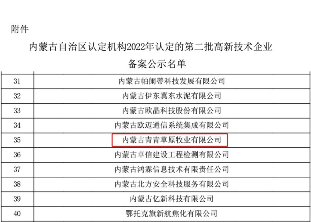 12月1日、12月14日,全国高新技术企业认定管理工作领导小组办公室分别公布了河南省2022年第一批高新技术企业备案通知和内蒙古自治区2022年第二批高新技术企业备案通知,内蒙古青青草原牧业有限公司及权属子公司河南中羊牧业有限公司均成功入选。