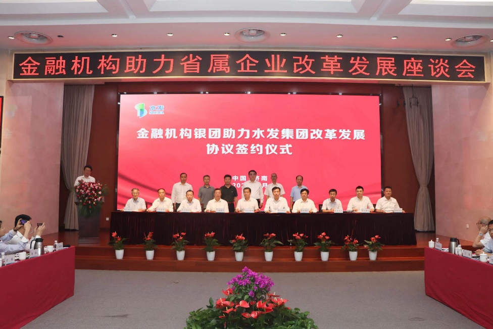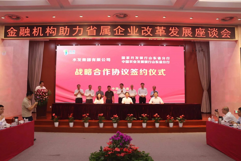 会上,国家开发银行山东省分行、中国工商银行山东省分行、中国建设银行山东省分行、中国银行山东省分行、中国农业银行山东省分行、中信银行济南分行、恒丰银行济南分行、民生银行济南分行、渤海银行济南分行等银行与水发集团签署了金融机构银团助力水发集团改革发展协议,国家开发银行山东省分行、中国农业发展银行山东省分行分别与水发集团签署了战略合作协议。